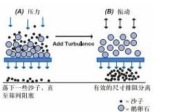 (A)對混合物施加直接的壓力,使得底部砂粒落下;在篩網表面形成一個鵝卵石層,阻礙頂部砂粒向篩網方向移動并通過篩網。