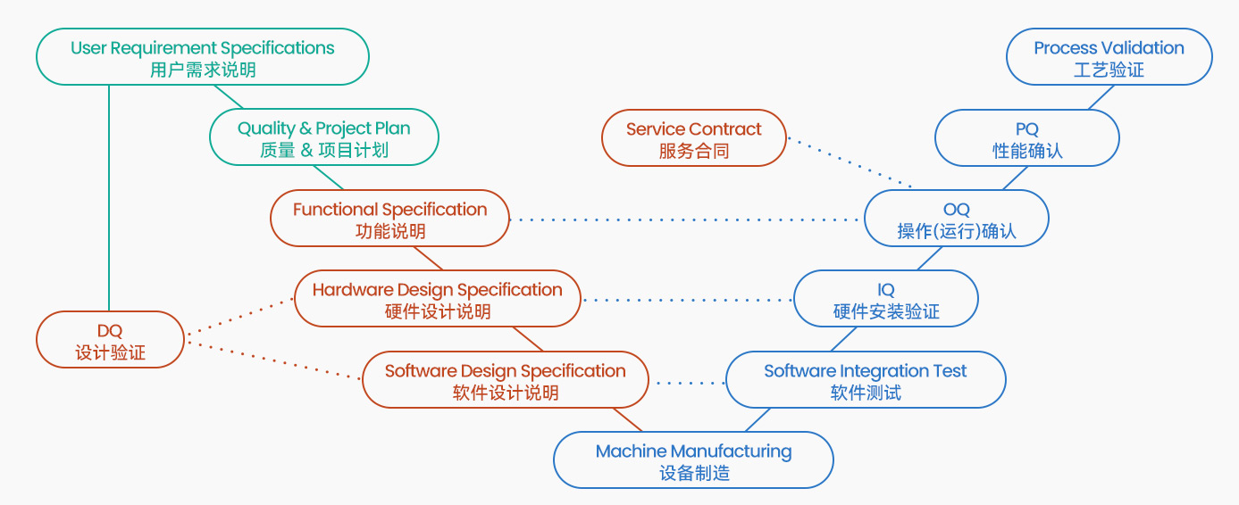 在設備的設計、加工及制造完成后,我們還為設備提供全面的工廠驗收測試(FAT),檢驗是否符合您的URS標準。 若FAT測試順利完成,設備就可裝箱發貨,再進行3Q認證:安裝確認(IQ)→ 運行確認(OQ)→ 性能確認(PQ)。FAT驗證服務能夠幫助及早發現問題并將其及時就地解決,為整個項目節省可觀的時間,也會使設備制造流程的條理更加清晰,可以說FAT測試在整個項目過程中極其重要。 |