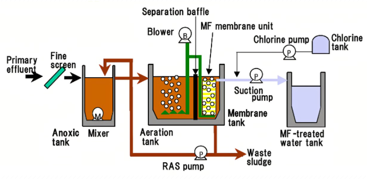 膜生物反應器是一種新型的廢水處理系統,它結合了膜分離技術和生物處理技術,也稱為MBR。傳統的生物處理技術被終端二沉池膜組件取代,可以保持生物反應器中高活性污泥濃度,有效提高生物處理有機負荷。為了減少污水處理設施的占地面積,污泥負荷可以保持較低,從而減少剩余污泥的量。主要原理是使用膜分離設備攔截水中的活性污泥和大分子有機物。其活性淤泥濃度可達8000~10000mg/L,或更高。反應器截留效果非常明顯,可有效保留長周期微生物,實現污水深度凈化,增加硝化細菌增殖,除磷脫氮效果更好。