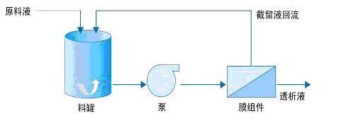 在過濾過程中料液通過泵的加壓,料液以一定流速沿著濾膜的表面流過,大于膜截留分子量的物質分子不透過膜流回料罐,小于膜截留分子量的物質或分子透過膜,形成透析液。故膜系統都有兩個出口,一是回流液(濃縮液)出口,另一是透析液出口。在單位時間(Hr)單位膜面積(m2)透析液流出的量(L)稱為膜通量(LMH),即過濾速度。影響膜通量的因素有:溫度、壓力、固含量(TDS)、離子濃度、黏度等。